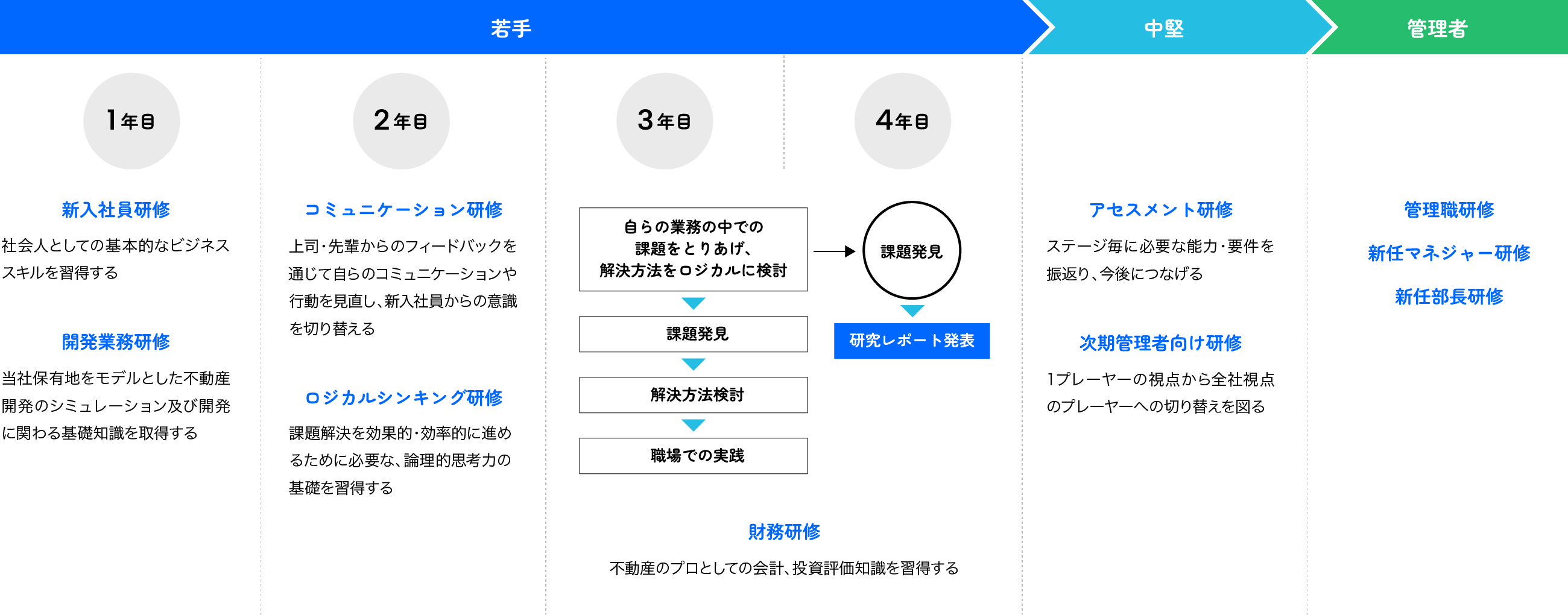 基礎力を養成 - 若手のうちは、一人前のプレイヤーに成長することを目標に、能力・スキルを高めるための定期的な研修を提供しています。また3年間のOJT制度により、先輩社員の助言を受けながら仕事のやり方を学び、多様な経験を獲得していきます。