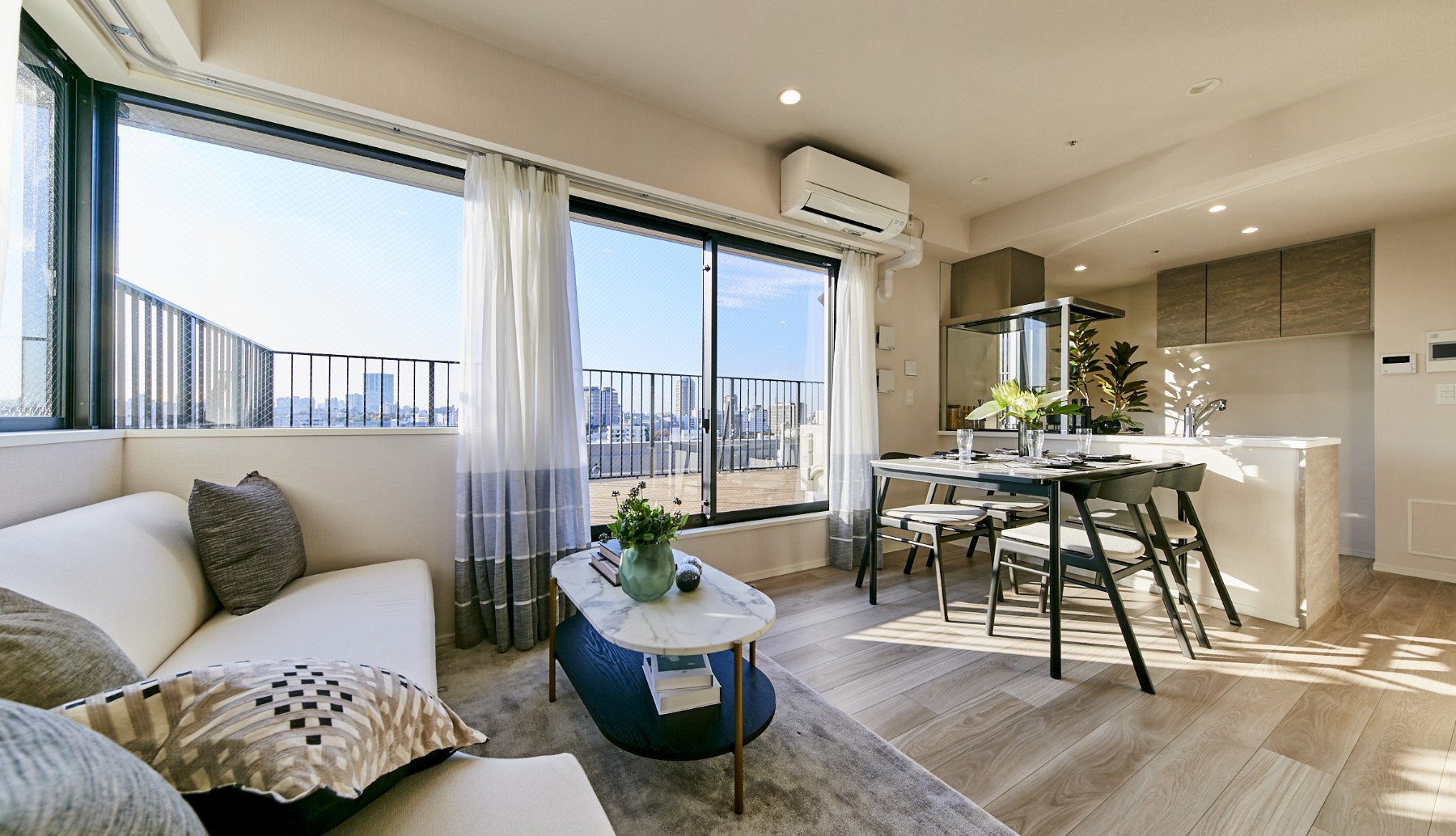 また、眺望を活かしたもう一つの魅力創出が、最上階に設けた一戸限定のプレミア住戸だった。検討を重ねた結果、新宿区を一望できるルーフバルコニーを設けるとともに、できるだけ窓を大きくとって眺望を楽しめる、またふんだんに自然光の射し込む明るい部屋になる設計とした。さらにプレミア住戸に住むお客さまを想定して、アーバネックスの通常の住戸で実装されている床暖房や浴室テレビなどの仕様に加え、開放的なカウンターキッチンを備え付けることで、キッチンに立ちながらも街を一望できる特別な空間に仕上げた。