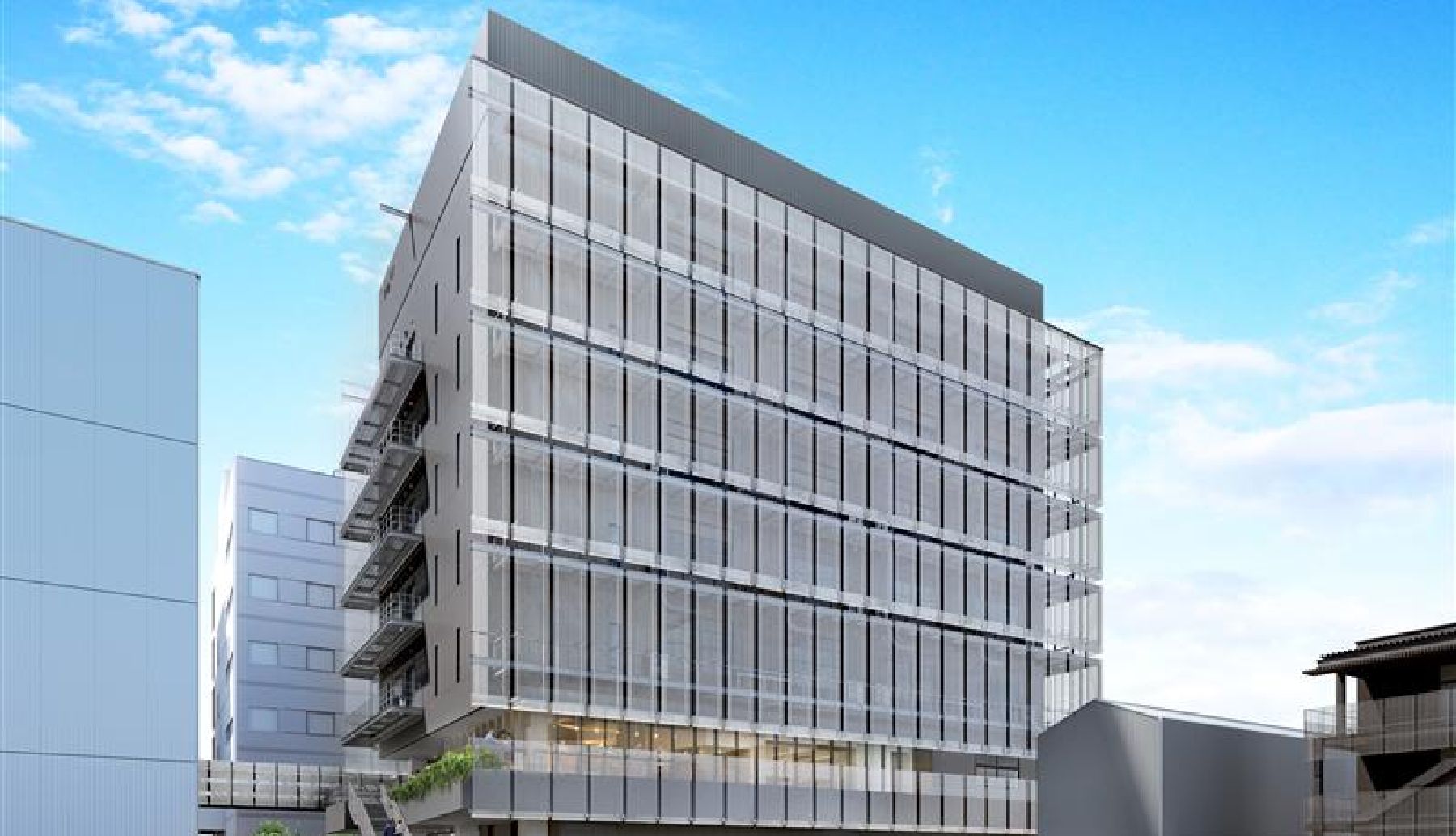 ほかにも、外装については京都らしさを取り入れるため、和の伝統的な建築要素である「すだれ」に着想を得たファサードを採用した。これにより、バルコニーに設置された設備機器や配管をほどよく隠すとともに、研究環境に影響を与える日射や換気といった環境制御の面でも効果を発揮する作りとした。